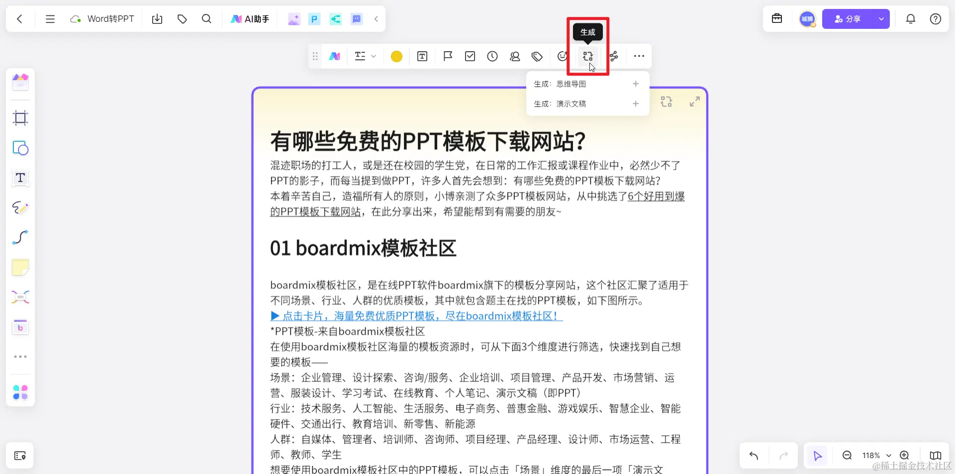 在设置妥当之后,单击选中整个boardmix文档,点击上方工具栏的「生成」,选择「生成:演示文稿」。