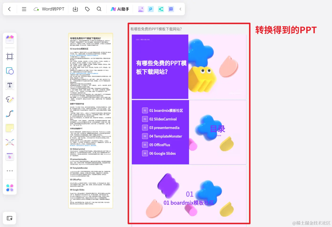 随着技术的发展,现在已经有许多在线工具可以快速地将Word转化为PPT。这些工具不仅能够保留原始文档的格式,还能大大节省我们的时间和精力,最为典型的就是免费的Word转PPT在线工具【boardmix】 。