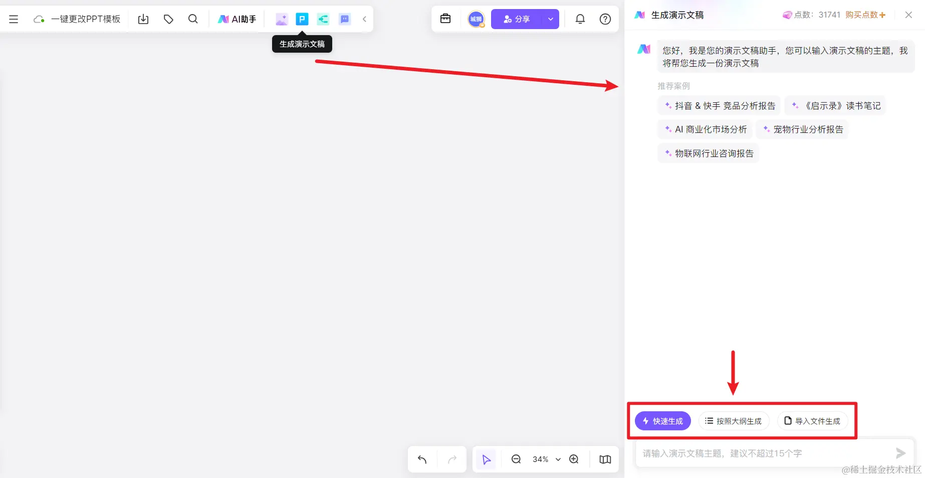 - 按照大纲生成:AI基于我们输入的主题,先生成一份PPT的大纲,我们可以对生成的大纲进行调整,之后再基于大纲生成一份PPT