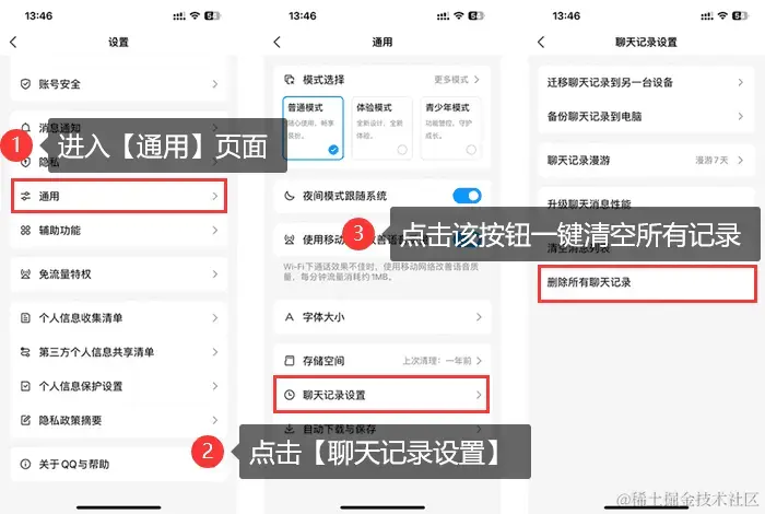 步骤2:在设置界面中依次点击**【通用】-【聊天记录设置】选项,然后点击列表中的最后一项【删除所有聊天记录】**即可清空所有QQ聊天信息。