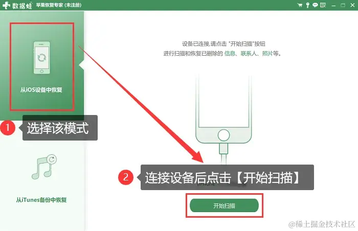 步骤2:选择恢复模式。打开软件后选择**【从iOS设备中恢复】**选项,并用数据线来连接您的iPhone和电脑。