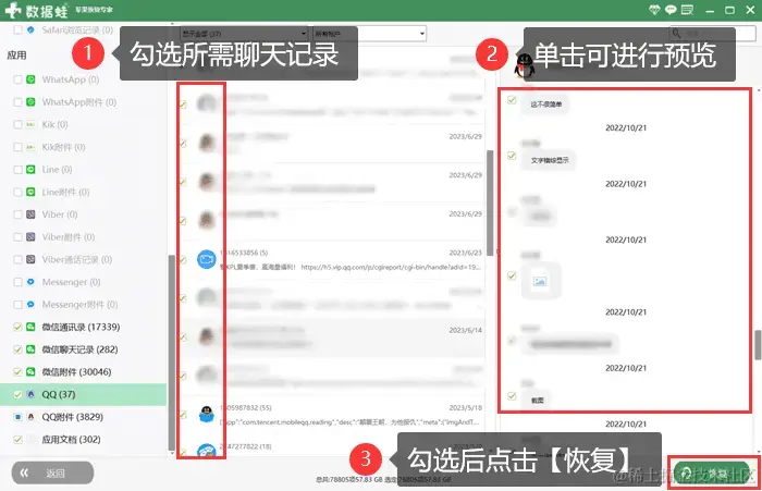 步骤4:恢复数据。扫描完成后,在软件左侧目录中找到扫描出来的QQ聊天记录数据,单击聊天记录可以在页面右侧进行简单预览。确认无误后点击**【恢复】**按钮,将选中的聊天记录保存到电脑上。