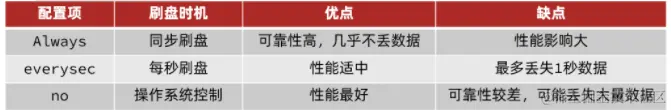 # 表示每执行一次写命令,立即记录到AOF文件 appendfsync always # 写命令执行完先放入AOF缓冲区,然后表示每隔1秒将缓冲区数据写到AOF文件,是默认方案 appendfsync everysec # 写命令执行完先放入AOF缓冲区,由操作系统决定何时将缓冲区内容写回磁盘 appendfsync no -
