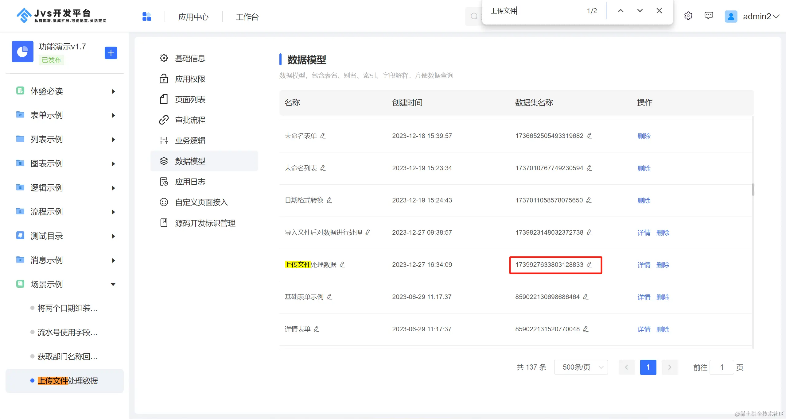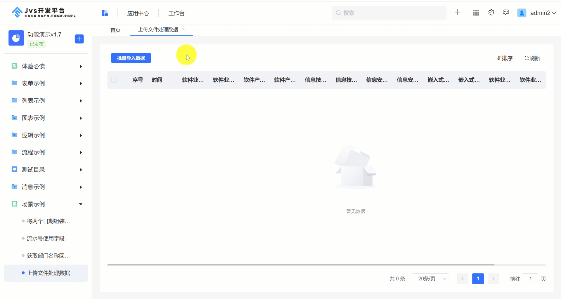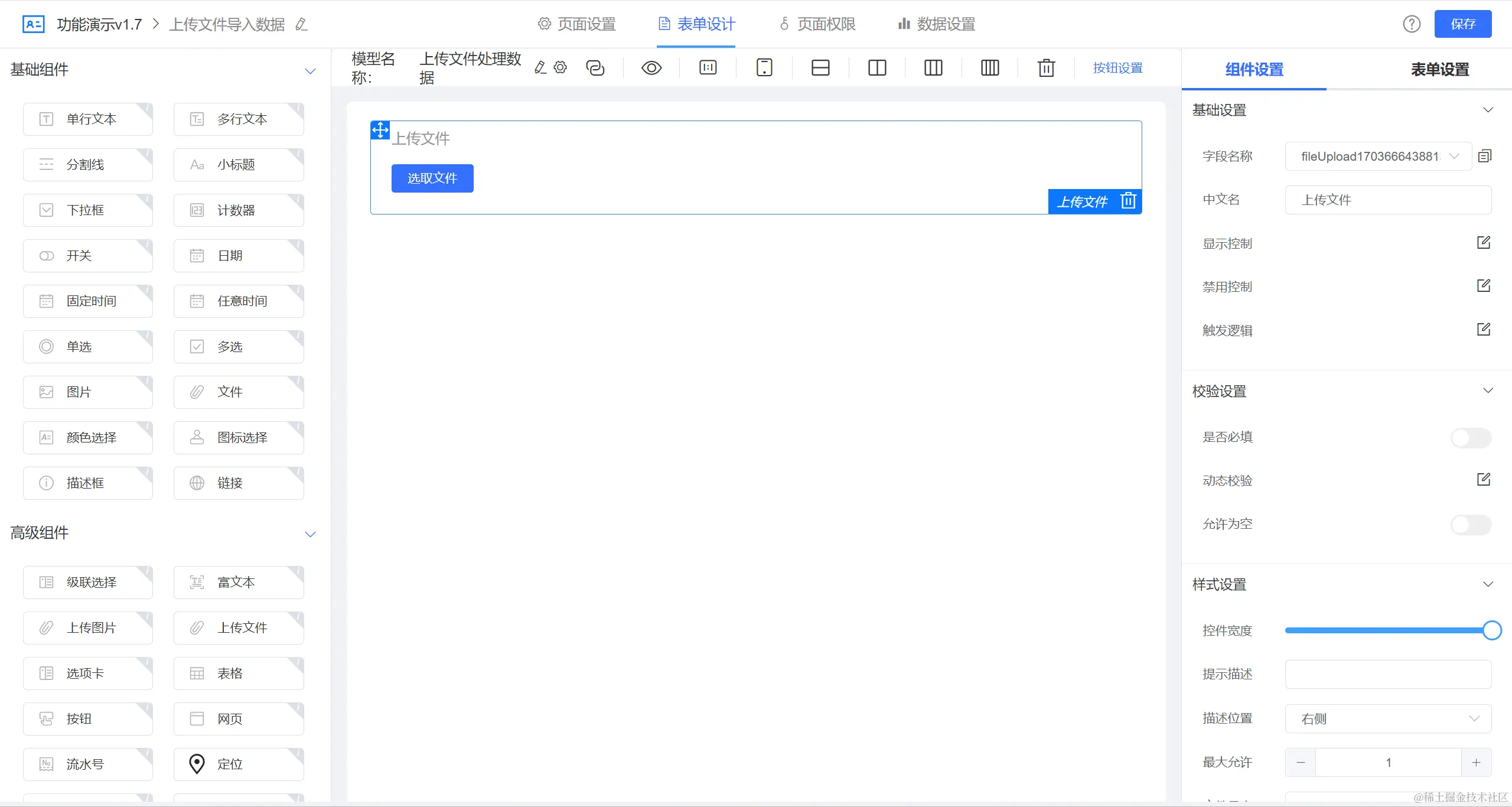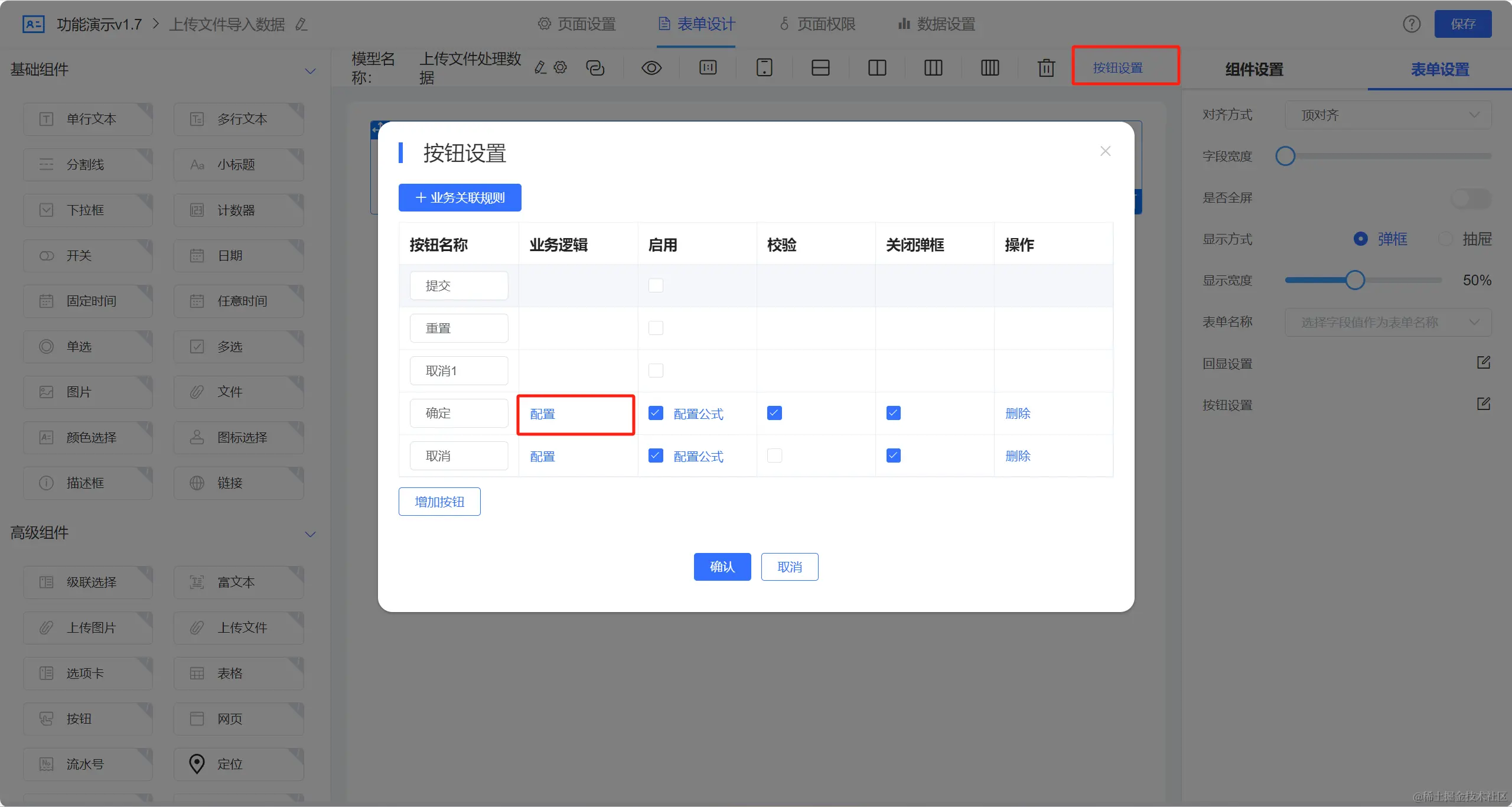设计思路:通过在列表页添加顶部按钮打开表单上传文件,配置自定义按钮提交触发逻辑,然后在逻辑引擎中对上传的文件解析并将解析的数据新增至列表页中。