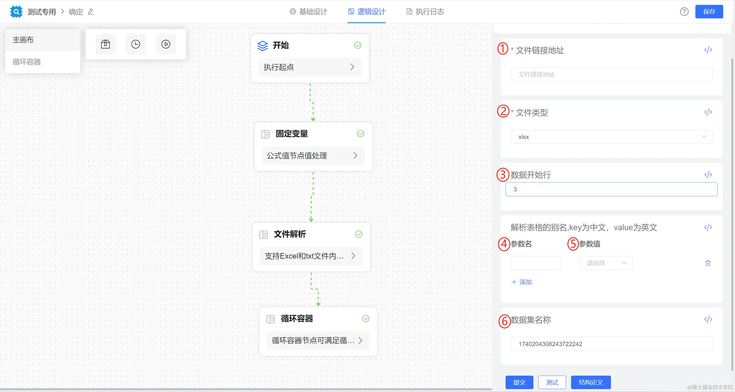 - 如果上传的文件表头字段与列表页设计的字段名称一致则不用填写参数名和参数值,直接通过数据集关联匹配。