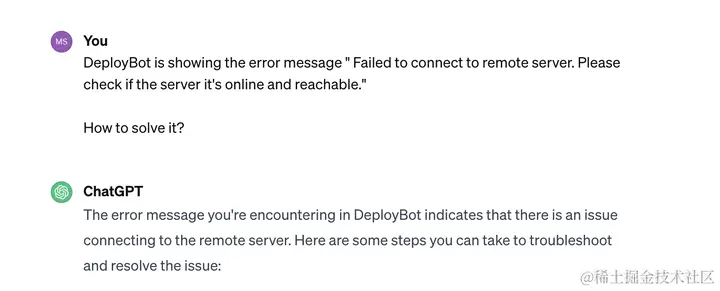 我询问 ChatGPT 如何解决尝试部署文件后在日志查看器中收到的此错误消息,我得到了有助于识别问题的操作列表。