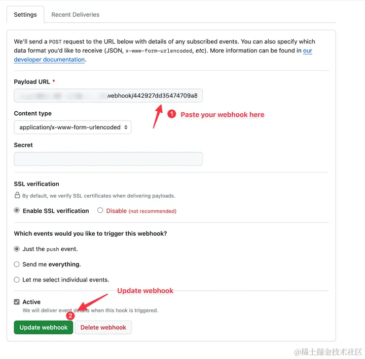 然后,我添加了 Webhook,将复制的 Webhook URL 从 DeployBot 粘贴到 GitHub Payload。URL,然后点击“更新网络钩子”。