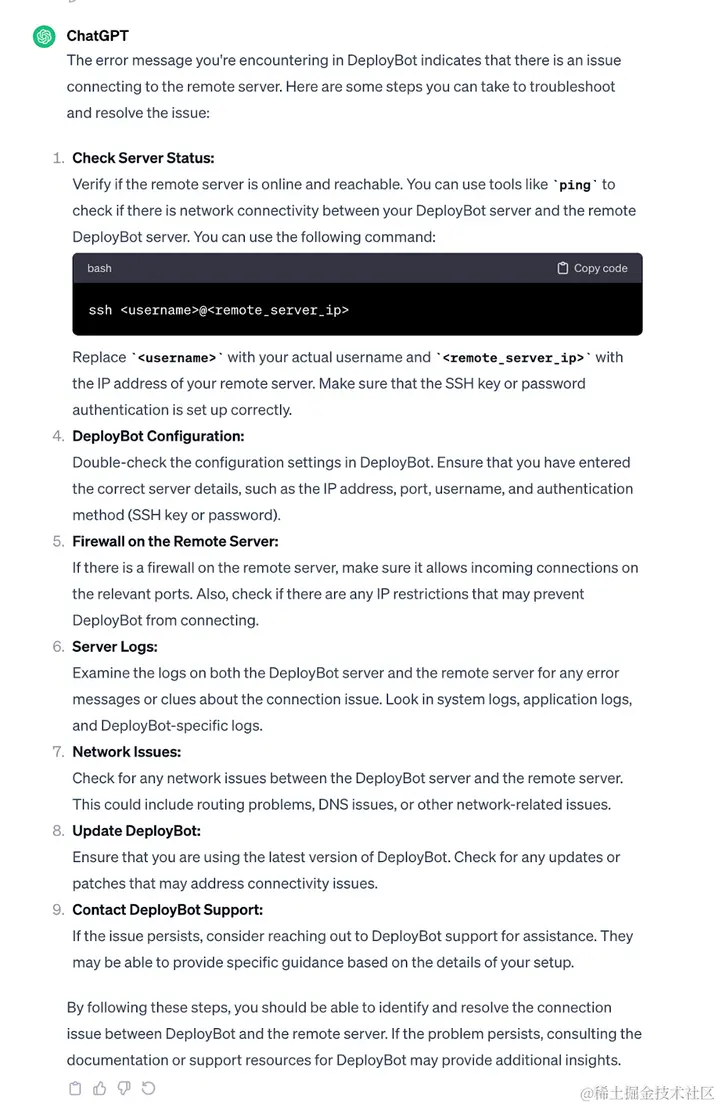 以下是 ChatGPT 建议我应该尝试的 DeployBot 问题的可能解决方案列表。