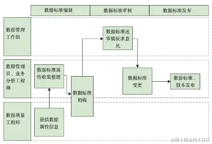 数据标准管理的制度应在组织分工的基础上明确数据标准申请流程、数据标准制定流程、数据标准发布流程、标准执行流程、标准复核流程及数据标准变更流程的管理要求和职责分工。