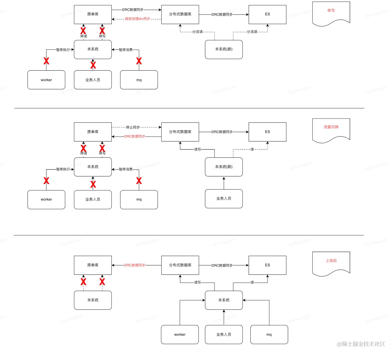 停止原系统分组,确保原单库不再存有写流量,同时协调DBA对原库执行禁写(关闭worker, 暂停MQ消费)