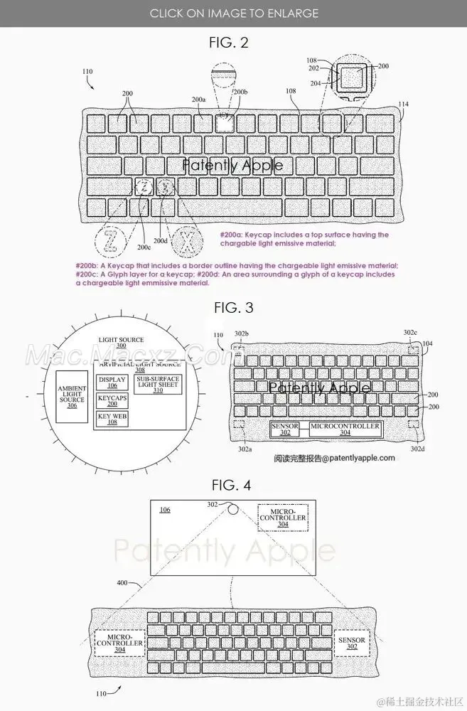苹果的专利图 2 显示了可充电的发光材料覆盖整个键盘;图 3 展示了一个键盘#110 的示例实施方式,包括传感器#302 和微控制器#304。