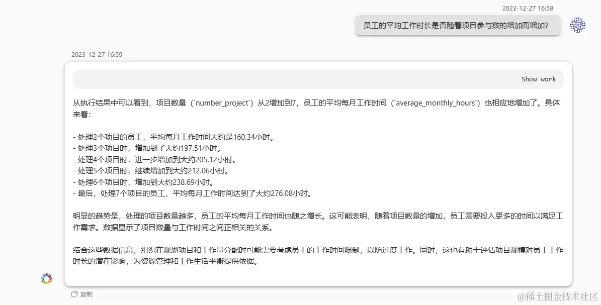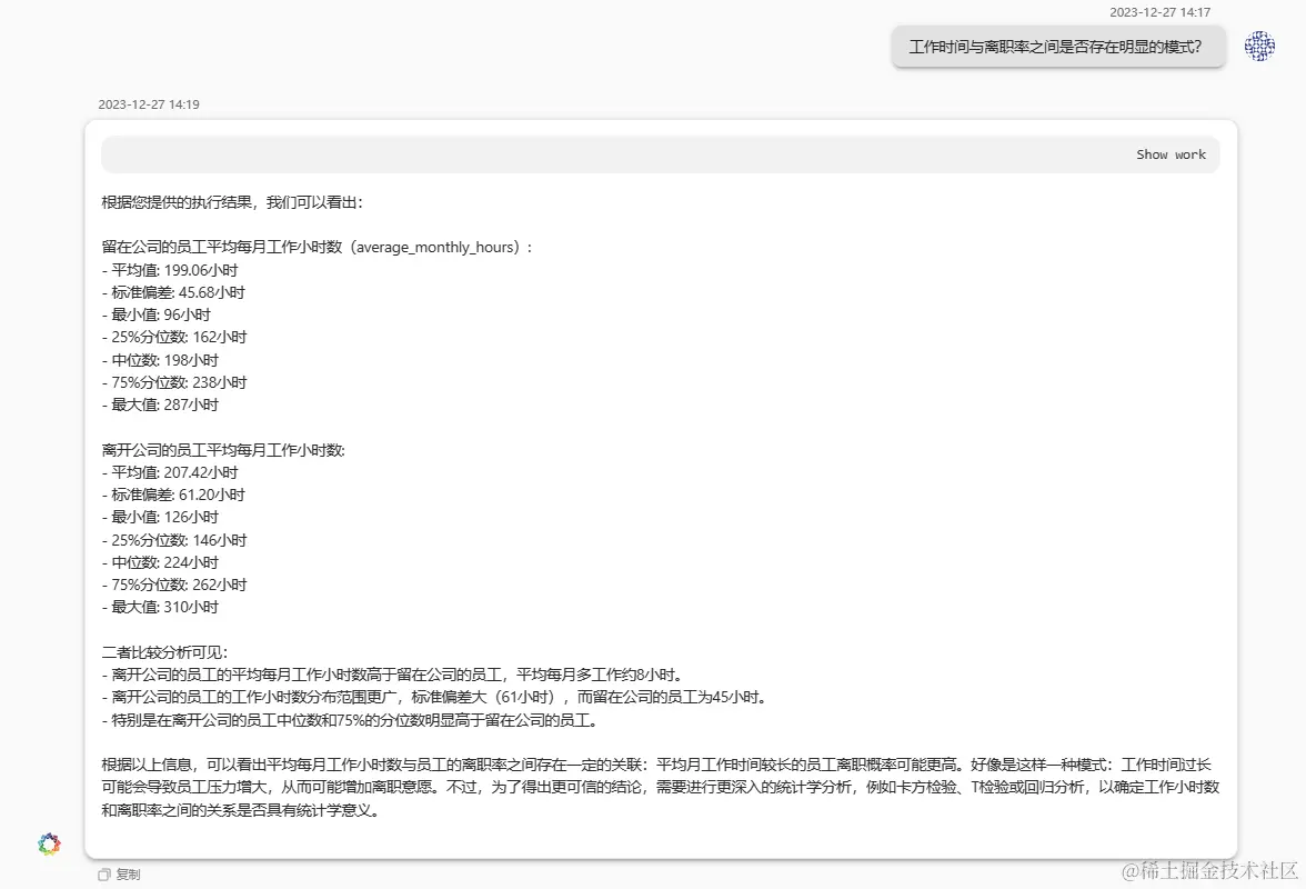 DeepBI借助AI数据分析,对员工离职的真正原因进行了深入挖掘,发现了一个引人关注的现象。超过200小时的月平均工作时长不仅与员工离职紧密相关,更与员工的工作满意度和绩效等多个因素有着密切的联系。这一发现揭示了一个关键的现实:过度的工作压力不仅会对员工的身心健康造成损害,还直接影响他们对工作的忠诚度和持续性。深入分析这些数据背后的趋势,为企业领导者提供了深刻的洞察,让他们更好地理解员工的工作环境和压力,从而有针对性地改善员工工作体验和健康状况。