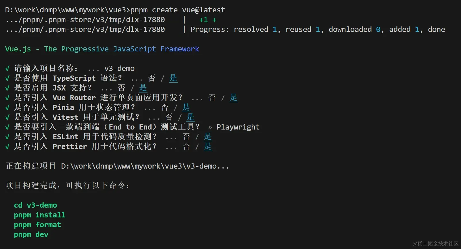 这一指令将会安装并执行 create-vue,它是 Vue 官方的项目脚手架工具。