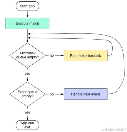 在每次事件循环中,Dart 总是先查询 微任务队列 中是否有可执行任务,没有才会去处理 事件队列 里的任务。完整流程示意图如下: