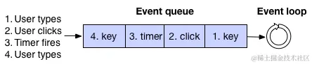 所谓的 Event Loop(事件循环) 就是:只要事件队列不为空,就不断从中获取一个事件并对其进行处理。事件可能是:用户输入、文件 I/O 通知、计时器等,简易示例图如下: