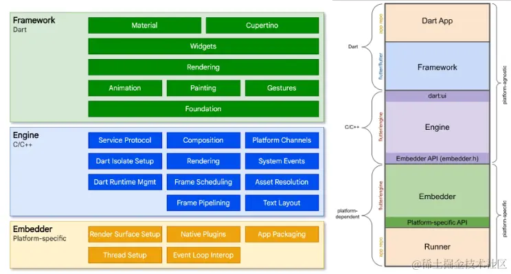 Flutter主打一个 跨端,架构自然跟 Android架构大相径庭,《官方文档》给出这样的 Flutter分层架构图: