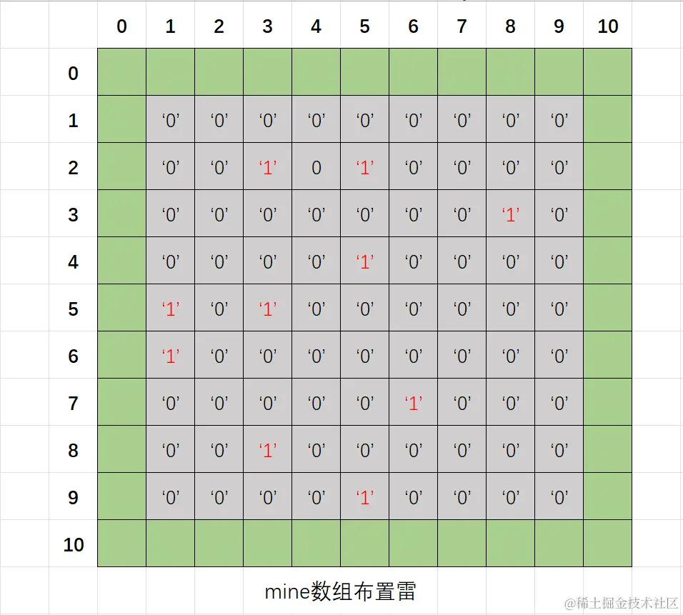 我们要在9×9的棋盘上操作,自然使用数组模拟,并且我们先假设0代表无雷,1代表雷