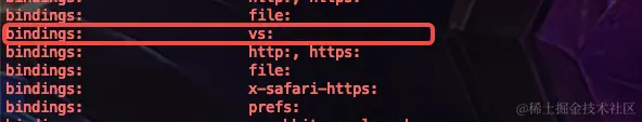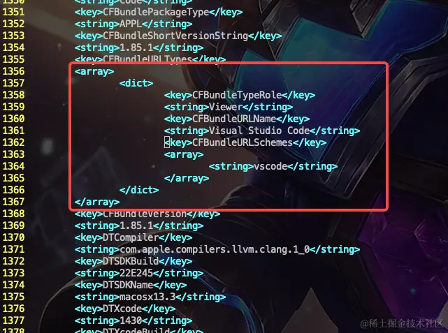 这里大家应该都能看懂,是一个数组里套了个字典。通过配置CFBundleURLSchemes这个key,值为vscode就代表了定义了一个vscode的协议。几乎每个应用都会有自己的伪协议。