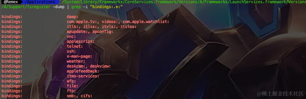 这里我再多说一下怎么查询Mac中的自定义协议,系统中有一个LaunchServices的概念,是负责应用程序的注册启动等相关的内容的。