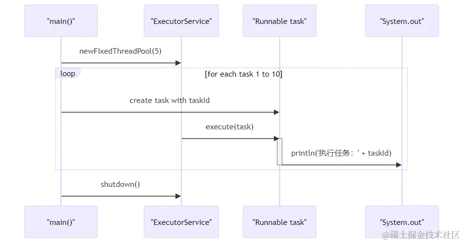 这段代码创建了一个固定大小为5的线程池。Executors.newFixedThreadPool(5)这一行代码就完成了这个魔法。然后,咱们通过一个循环创建了10个任务,通过threadPool.execute()方法提交到线程池中执行。每个任务只是简单地打印出它的任务ID和执行它的线程名。