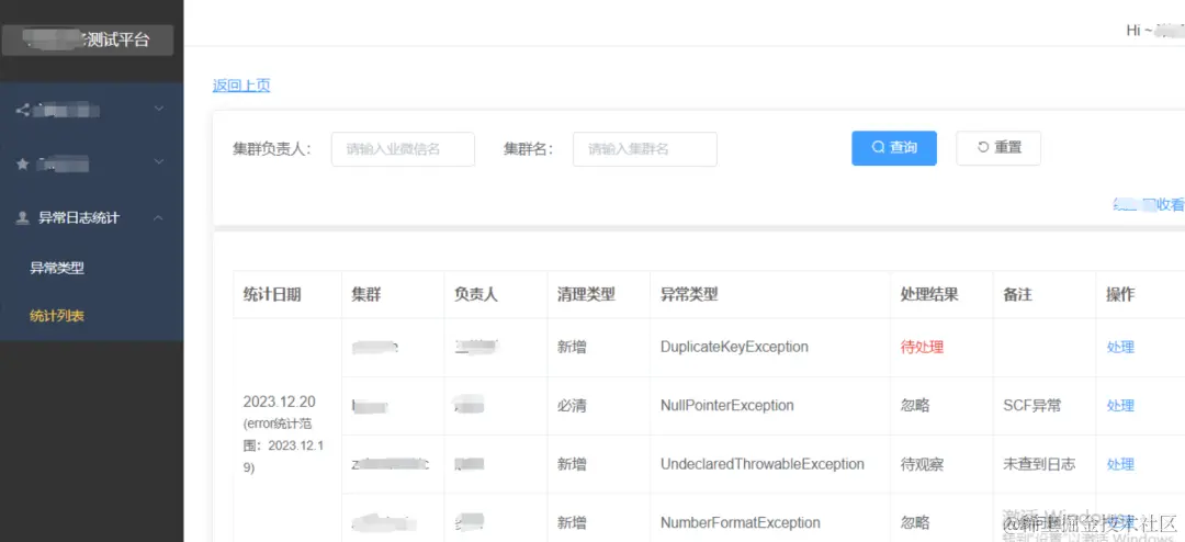 统计列表展示每个周期新统计出的异常类型数据,每个异常类型对应的负责人处理后在此填写处理结果,通过标红的方式很快查询待处理的异常。