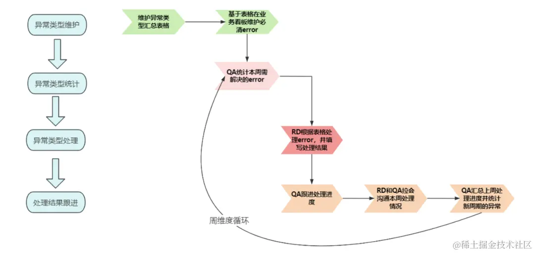 在进行日志清理之前必须要有个适合的清理机制,才能使得日志清理实现正向循环,因此我们基于业务现状,和开发一起制定了一个清理机制:QA主要负责异常error的统计及清理情况的确认,而开发同学主要负责异常error的清理及清理情况的反馈。