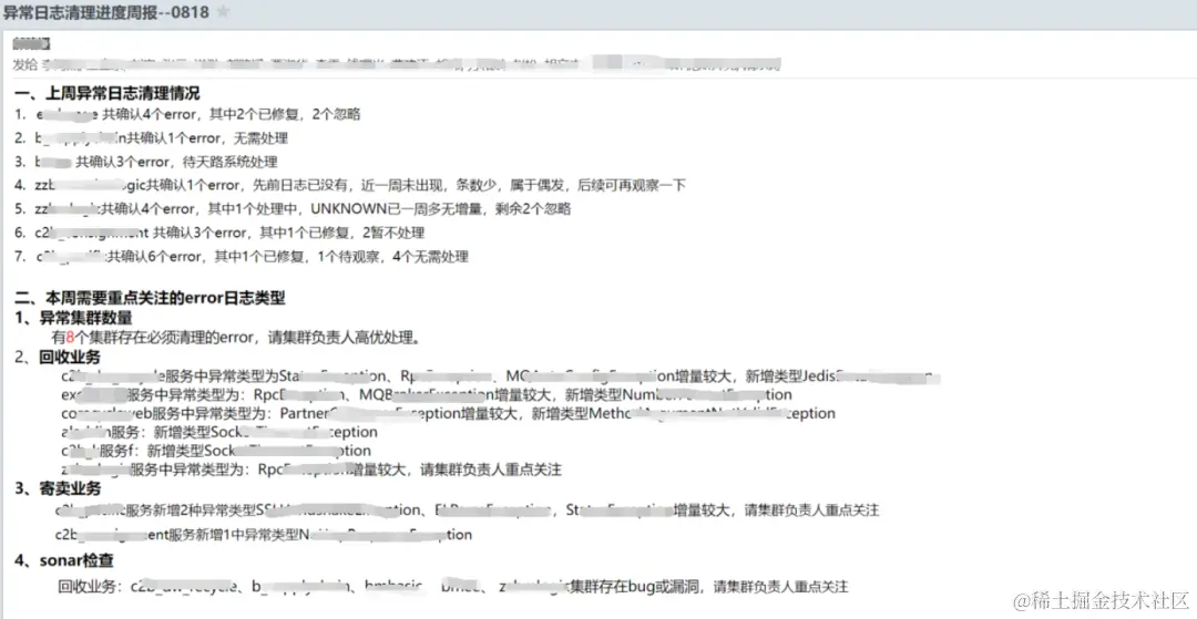 - 目前基本完成了存量异常日志的清零,截止到现在已进行过70多次的统计,累计统计了900+需要解决的异常error,累计解决异常问题近300条。
