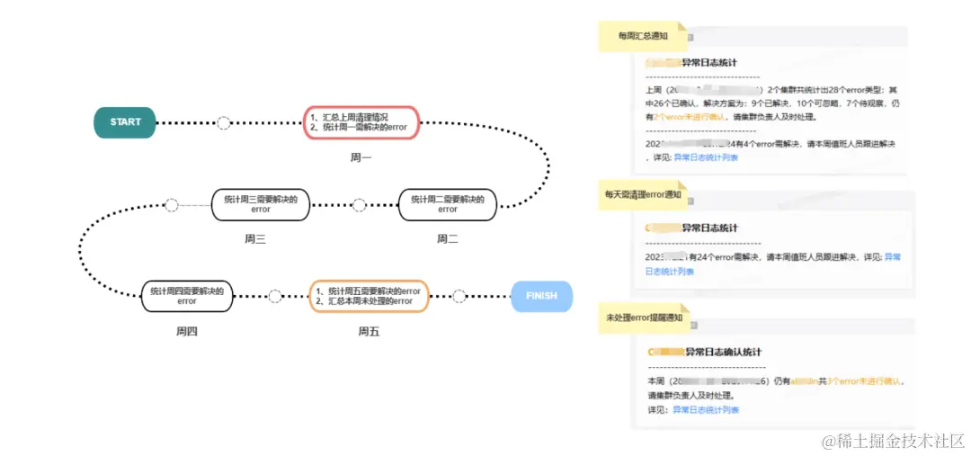 对每个集群出现的每个error都需要做同样的事情。当时清理的业务方为共有13个集群,每次统计本周和汇总上周进度,耗费QA同学2~3h左右的时间。