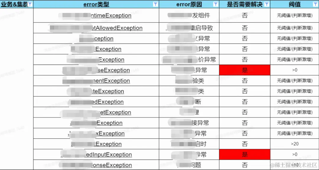 QA会和RD维护一份异常类型汇总的表格,主要包括:异常类型名称、是否必清、阈值。这个表格主要是作为一个基准,用于判断哪些异常可以忽略,哪些异常达到一定阈值后才需要处理,哪些异常只要出现就必须处理。当出现了不在此表格中的异常类型,则需要维护到该表格中。