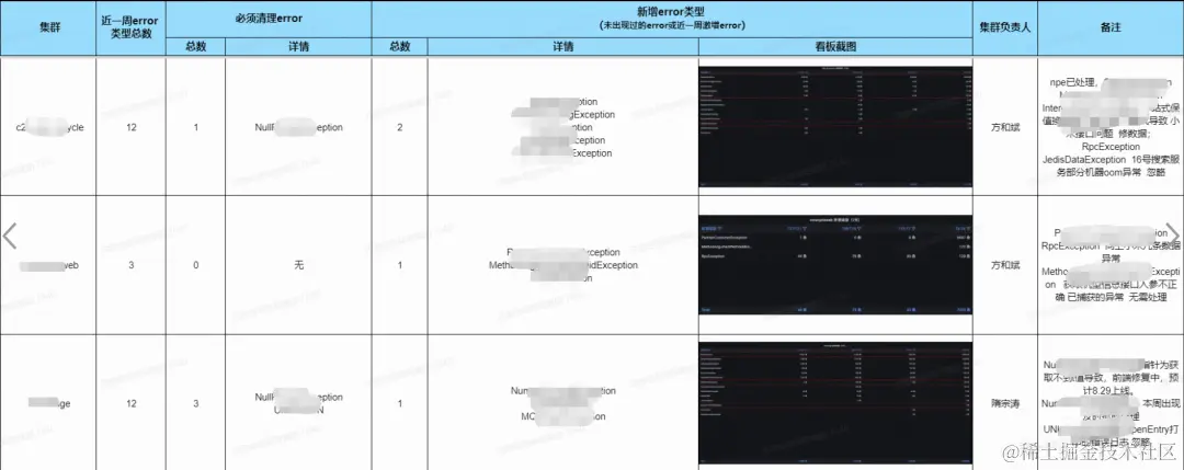 每周五QA同学会结合grafana平台业务看板整理出近一周需要清理的异常error表格。