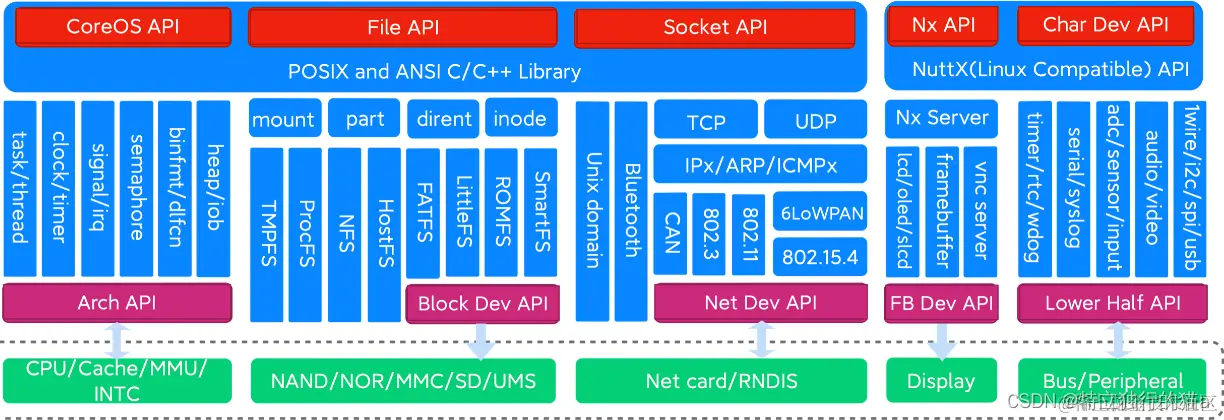 从纵向看,NuttX和传统操作系统一样由调度子系统、文件子系统、网络子系统、图形子系统和驱动子系统组成。从横向看,NuttX向上给应用程序提供了POSIX和ANSI定义的标准C/C++接口。对于没有标准化的组件(比如各种外设),NuttX通常会提供兼容Linux的API。向下NuttX定义了Arch API、块设备驱动接口、网卡驱动接口、display驱动接口,以及各种总线和外设的lower half驱动接口,使得芯片厂商能够规范、快速地完成移植工作。下图中数量众多的蓝色模块就是NuttX实现的各种功能。