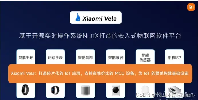 Xiaomi Vela 项目,是小米基于开源实时操作系统NuttX打造的嵌入式物联网软件平台。 小米基于 Apache NuttX 开发了为解决物联网碎片化而生的,物联网领域自研的嵌入式软件平台——Xiaomi Vela。在各种不同的物联网硬件上提供统一的软件平台,支持高性价比的MCU设备,为IoT的繁荣构建基础设施。 Xiaomi Vela 通过组件化能力,做到高度可伸缩、可裁剪,支持丰富的组件和易用的框架。同时,可以很方便的去支持功能差异跨度极大的各种物联网设备。还与 Linux 保持高度兼容性,适合做 Linux 的平替,帮助硬件实现降本。并基于物联网的特性,在多核异构、安全、超低功耗渲染和连接方面都建设了独有的能力。 IoT领域跟传统的PC和手机行业相比,最大的差异点就是IoT设备极其碎片化,这个碎片化给小米自身以及整个行业带来了效率低下的问题(代码的不可复用、软件的重复建设)。随着IoT行业的高速发展,到2030年全球还会新增150亿IoT设备,所带来的碎片化问题只会是越来越严重。因此,迫切的需要一个统一的软件平台来打通碎片化的IoT应用,让其能够和谐共通。
