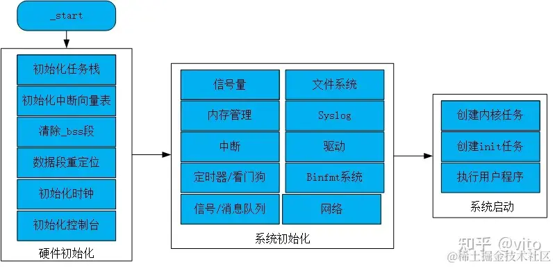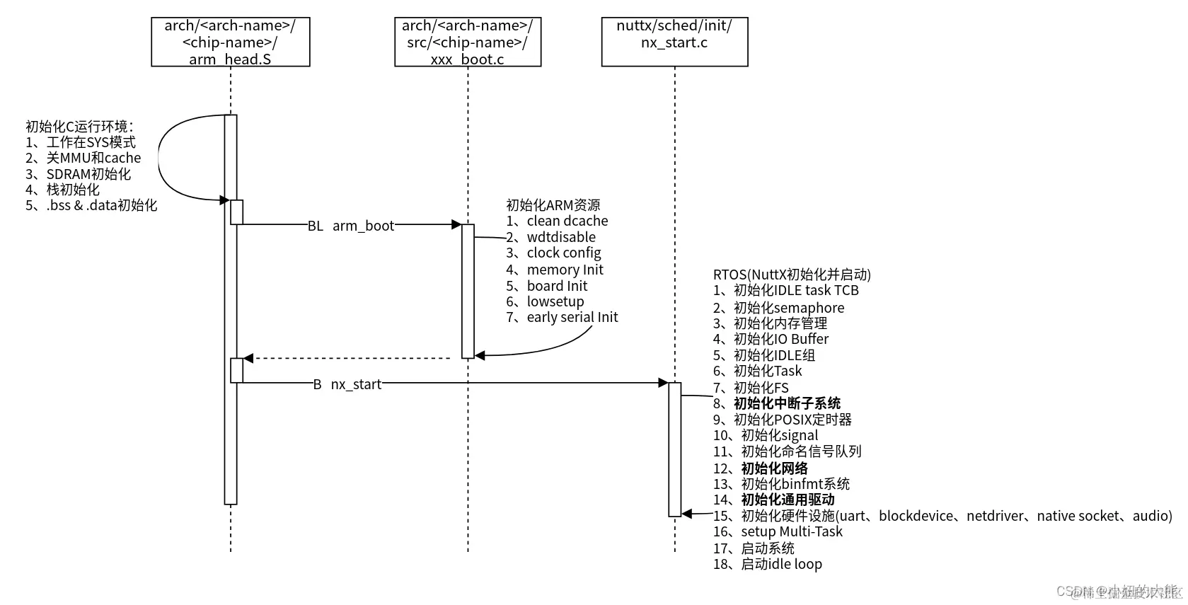 在NuttX内存布局中,KROM和UROM分别存放着内核启动和NSH启动的程序,启动流程如下图所示,下面对启动流程进行简要介绍。