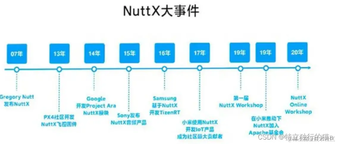 NuttX是一个成熟的实时操作系统,于07年由Gregory Nutt先生正式开源,2016年被三星选为TizenRT操作系统的内核,2019年在小米的推动下正式进入Apache基金会,经过开源社区多年的不懈努力,NuttX功能丰富,性能稳定,商业化成熟度高,Fitbit最近两代的手环产品和索尼多款消费级产品都是基于NuttX开发的。