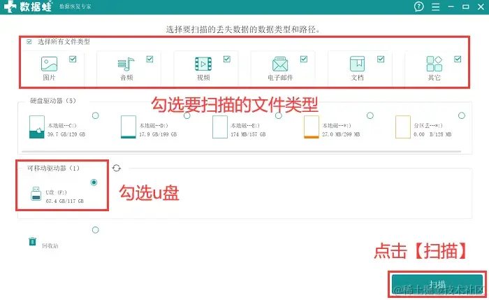 步骤2:勾选上需要恢复的文件类型,并勾选上u盘所在的盘符,然后点击 【扫描】 ;