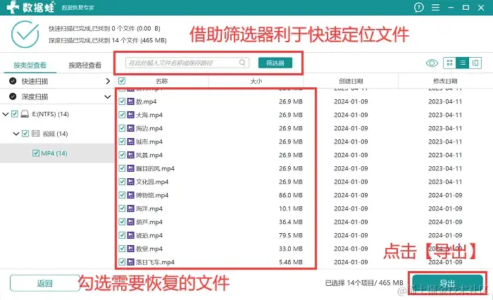 步骤4:深度扫描会对u盘进行全面的扫描,用户耐心等待扫描结束后,可再次对扫描结果进行查看,在结果较多的情况下,建议直接借助 【筛选器】对文件快速定位,完成文件选择后,点击 【导出】。