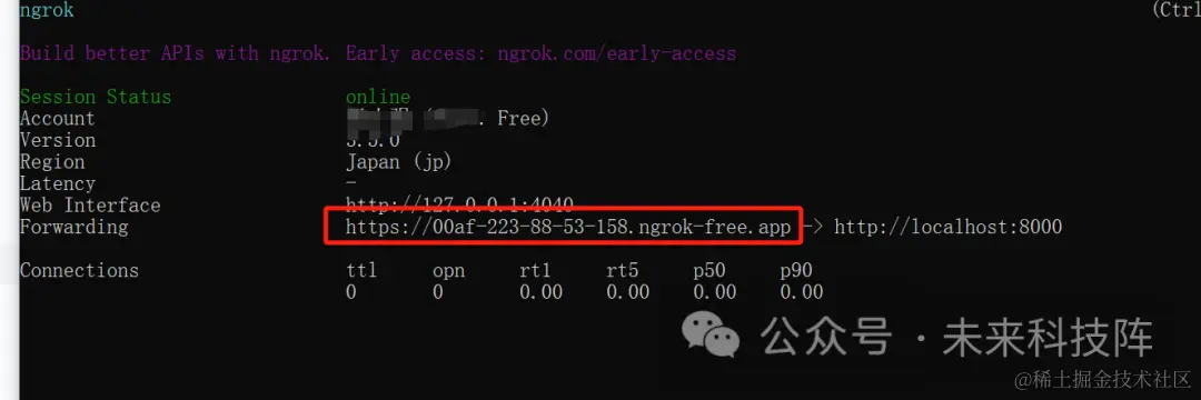 启动成功如图所示,红框为你外网地址,箭头后面为你的本地地址