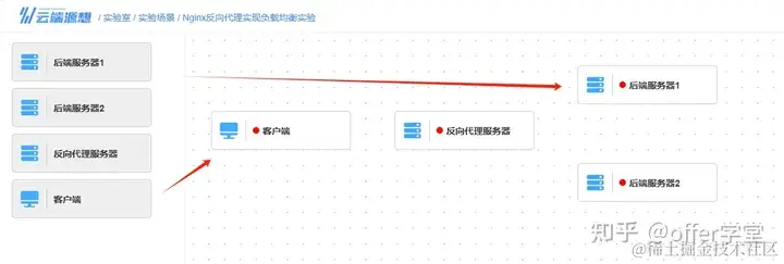 连线:连接一条客户端指向反向代理服务器(负载均衡服务器)的连线以及负载均衡服务器分别到两个后端服务器的连线,以创建访问权限