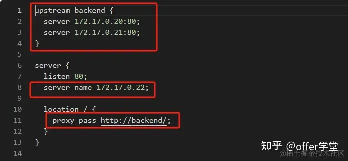 proxy_pass 将其配置为 upstream 块 名为 backend,保持 http:// 后名称统一,以做负载均衡访问转发