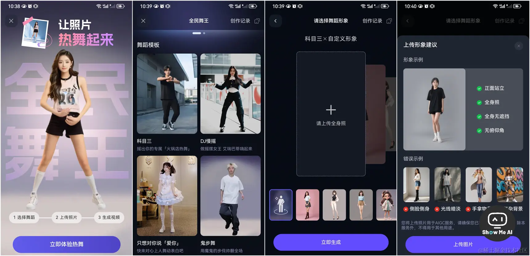 阿里最近整的另一个活是「通义听悟可以生成特定人物的跳舞视频了」!!操作步骤非常简单,只需要手机安装通义听悟App,在首页输入「全民舞王」,就可以进入主题页面啦 (👆 如左图1)!