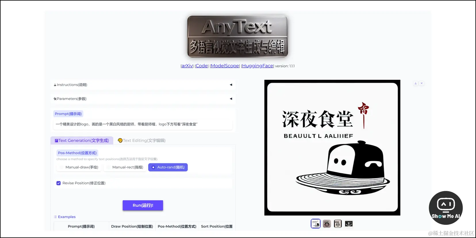 👆 这是项目的 Hugging Face 和魔搭社区的在线体验地址,跟随页面引导和说明操作就可以啦!非常简单~ AnyText 应该是目前生成含中文图片的最强大工具,整体测试下来效果非常不错!简单的海报、配图、Logo 、涂鸦、表情包等等,都可以动动手指快速完成啦!