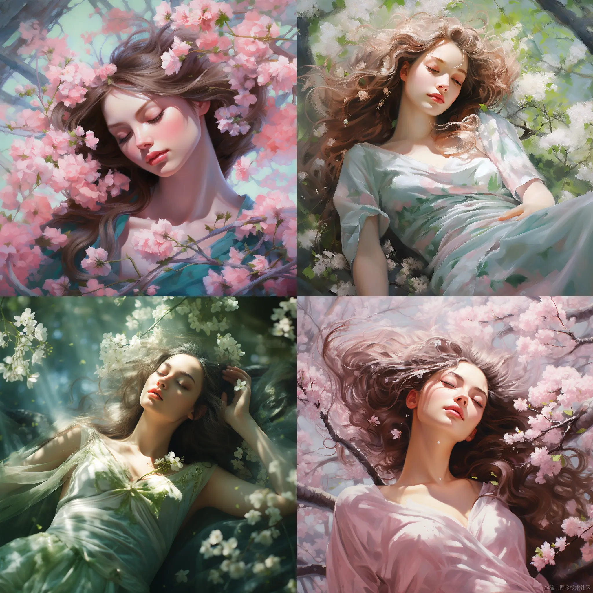 图片描述词: 春日里的樱花树下,一位少女闭目沉思,周围是绽放的花朵和轻轻摇曳的绿叶。