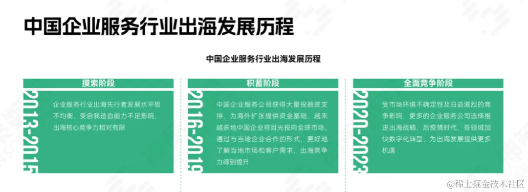 报告提到,中国企服行业出海经历了摸索、积蓄、全面竞争三个阶段,越来越多的中国软件产品希望构建一个全球化的软件企业。