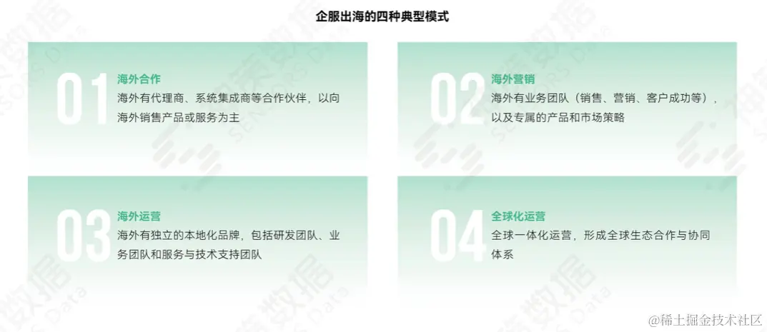 报告总结了企服出海的四种典型模式,包括海外合作、海外营销、海外运营和全球化运营,企业可以根据规模大小和服务客群的不同,选择更适合自己的出海路径。