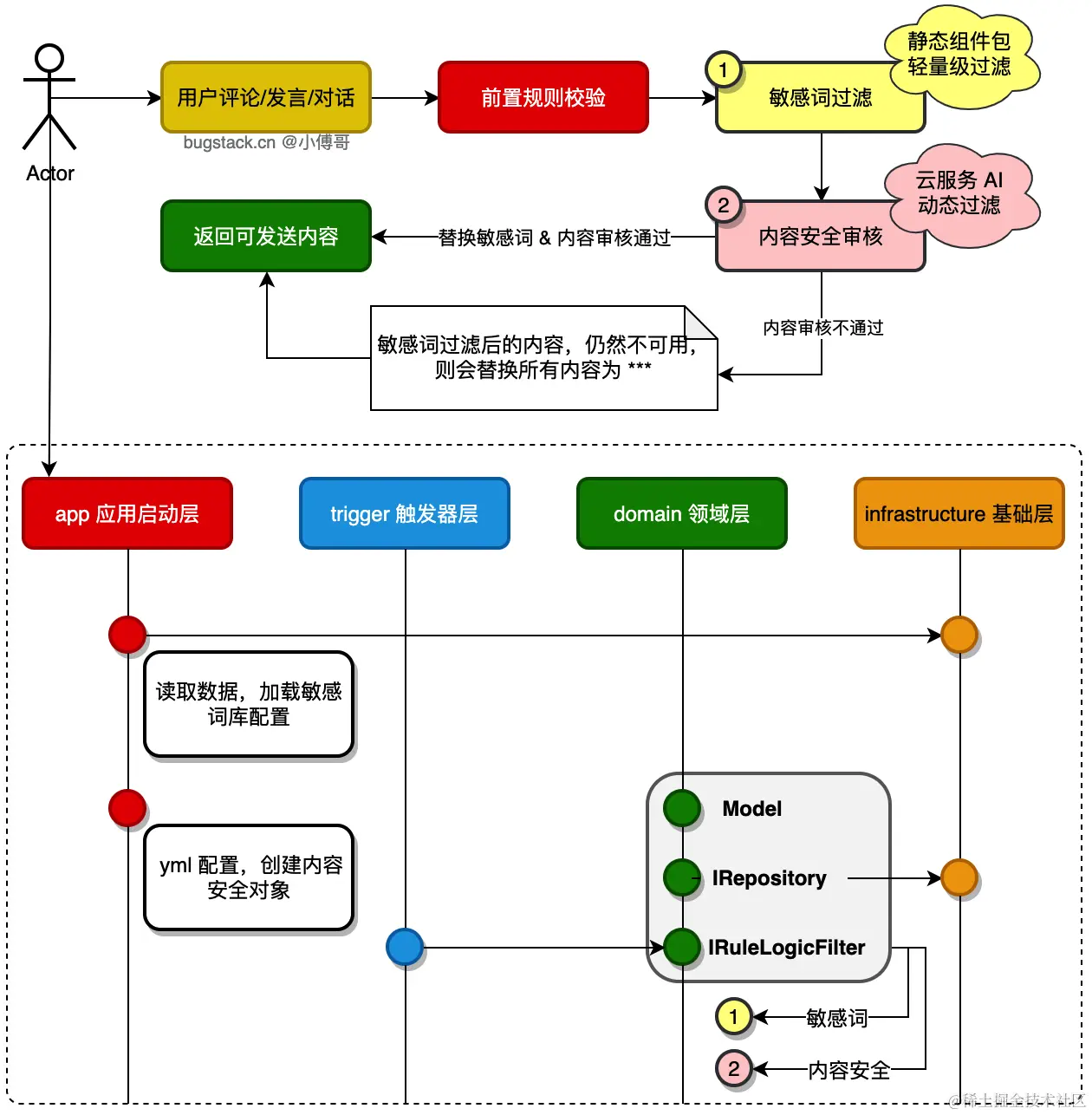 在本节小傅哥会通过 DDD 分层架构设计,开发出一个敏感词、内容安全审核过滤操作的规则处理器。在这个过程大家可以学习到 DDD 分层调用流程、规则模型的搭建、敏感词和内容审核的使用。