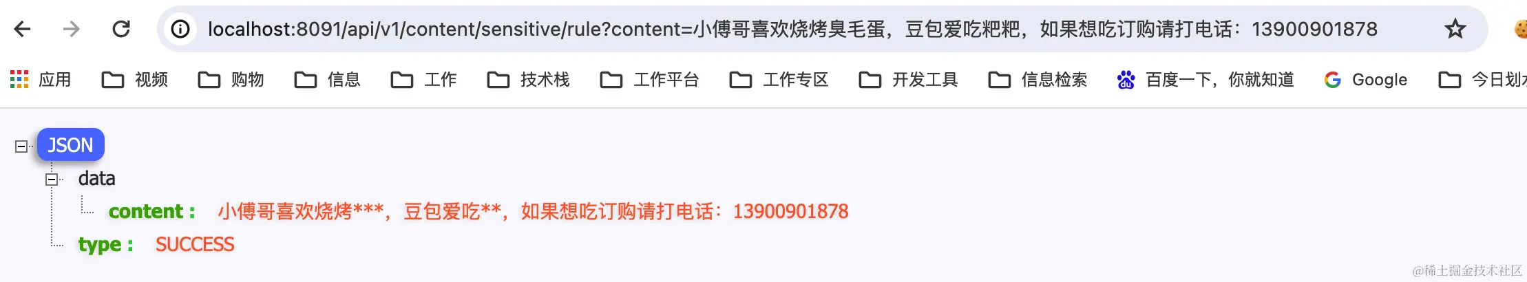 接口:http://localhost:8091/api/v1/content/sensitive/rule?content=小傅哥喜欢烧烤臭毛蛋,豆包爱吃粑粑,如果想吃订购请打电话:13900901878