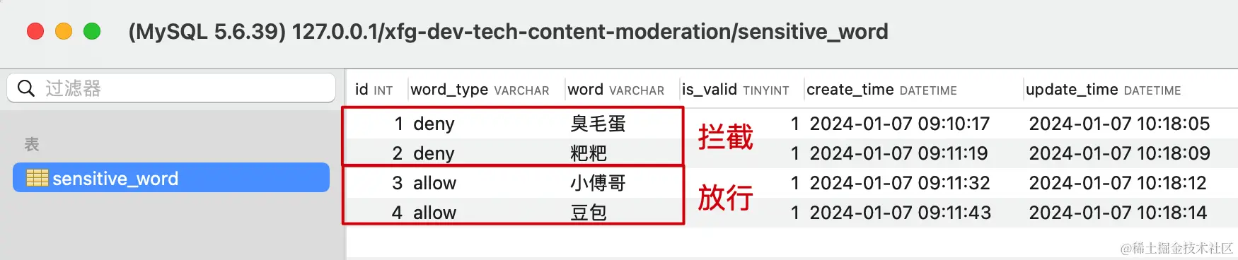 - wordDeny、wordAllow 是两个自定义的拦截和放行的敏感词列表,这里小傅哥设计从数据库中查询。可以方便动态的维护。