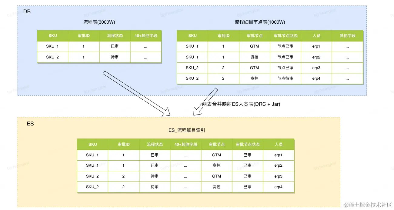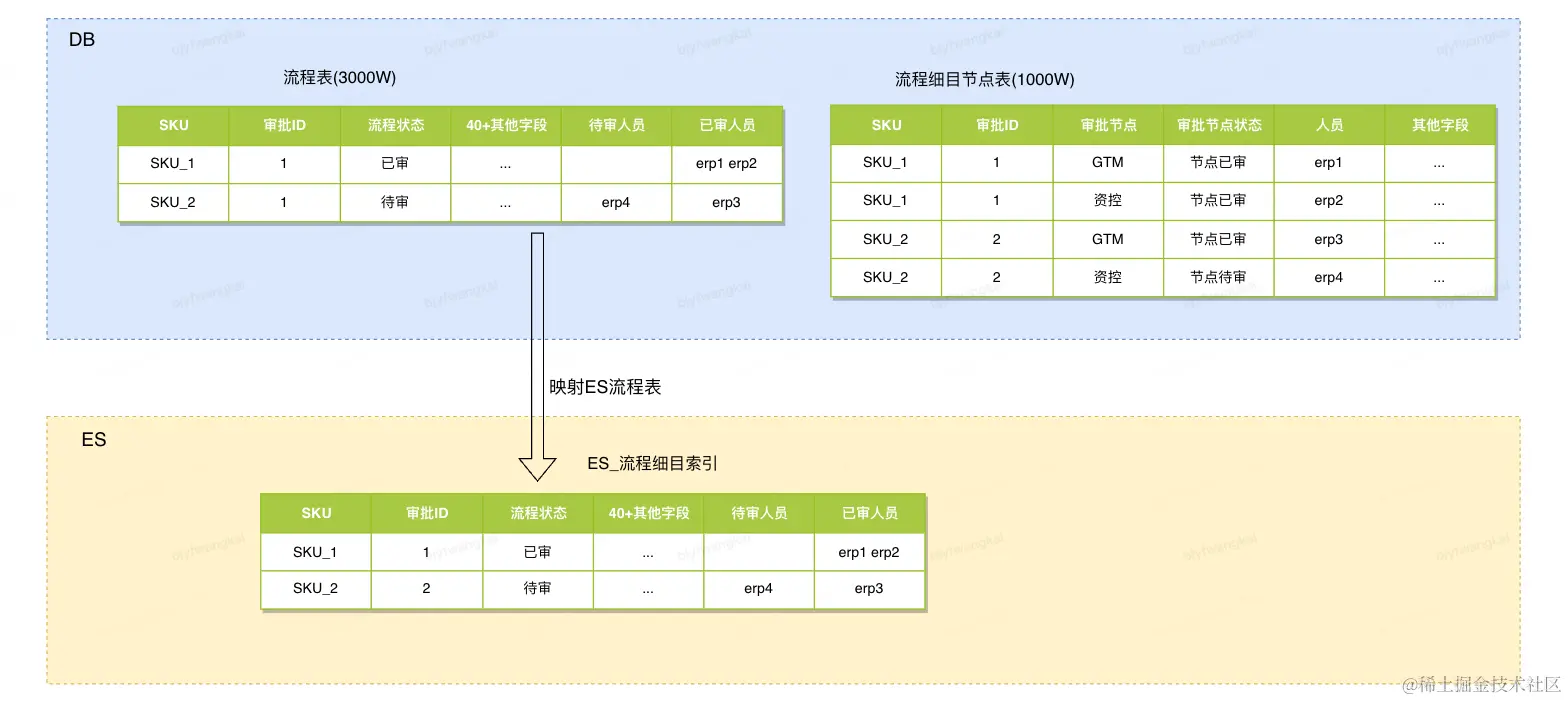 在DB的流程表增加待审人员, 已审人员字段, 字段的值使用空格分隔, 使用ES的分词功能, 同时ES可直接使用DRC工具直接同步此表数据, 减少同步的开发时间