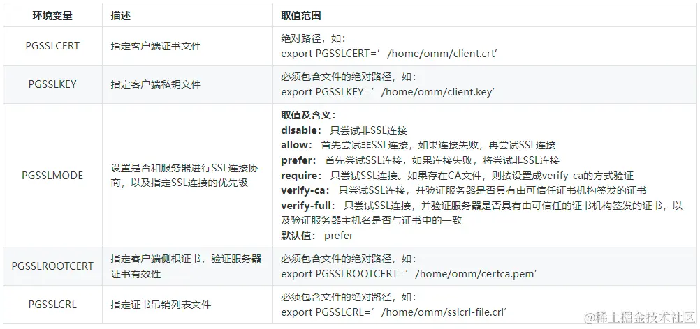单向认证,仅客户端验证服务器证书的合法性,设置参数:PGSSLMODE、PGSSLROOTCERT;