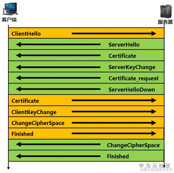 证书校验和秘钥协商在SSL的握手阶段实现,握手协议如下: